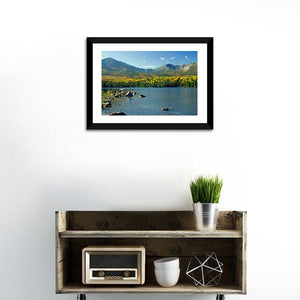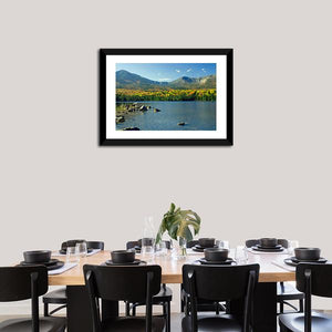 A serene, natural panoramic scene of a lake bordered by colorful autumn forest with rocks in the foreground, presented in a nature photography style. The blue, green, orange, and yellow palette brings calm depth and suits modern or nature-inspired rooms and room decor.