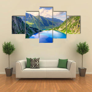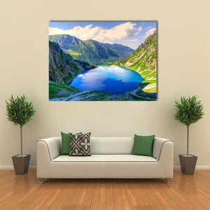 A realistic mountain-lake scene showing reflections in the water, lush green slopes and rocky peaks under fluffy clouds. The high-angle composition and rule-of-thirds create depth, while the blue, green, white and grey palette feels serene, majestic and vibrant. Suited to living room or bedroom wall decor for a calm, natural touch.