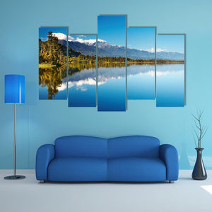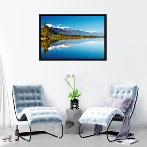A photorealistic canvas that captures a tranquil New Zealand lake set against snow-capped mountains and forest. The panoramic composition and calm reflections create a serene, balanced atmosphere that works well in modern living rooms, bedrooms, or offices seeking nature-focused wall decor.