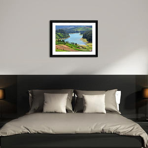 This panoramic canvas depicts a wide river or lake flanked by tree-covered hills and green grassy slopes, rendered in a realistic style. Cool blues, greens, browns and hints of yellow create a serene, natural, expansive daytime scene. It works well in modern living rooms, bedrooms or offices that favor nature-focused wall art.