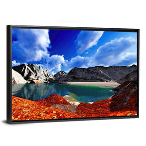 A landscape canvas showing craggy mountain peaks, a calm lake, and a foreground of reddish-orange rocks that creates depth and drama. The blue, white, grey, and orange palette feels both dramatic and serene and suits modern, nature-inspired rooms.