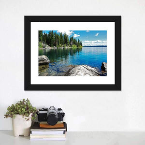 This canvas art beautifully captures a serene lakeside scene, featuring a peaceful reflection of tall evergreen trees amidst blue skies and gentle clouds. Ideal for bringing a touch of nature's tranquility into your home.