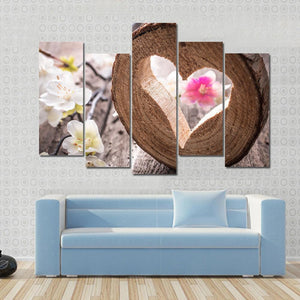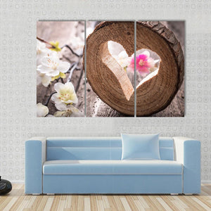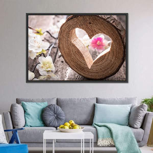 This canvas features a heart-shaped cutout in a rustic log surrounded by delicate pink and white blossoms. It captures a serene and romantic essence, making it a lovely addition to nature-inspired decor.