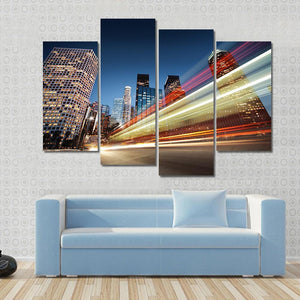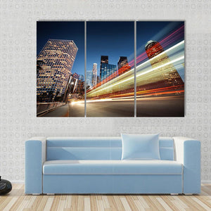 This dynamic canvas art captures the energy of a cityscape at night, showcasing streaking car lights against a backdrop of tall buildings. With its vibrant palette of blues, yellows, and oranges, it brings a modern touch to any space.