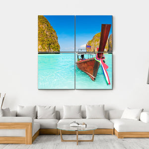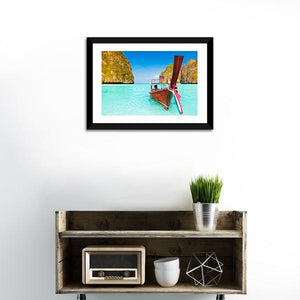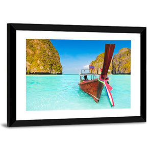 This realistic canvas art captures the serene beauty of Maya Bay in Thailand, featuring a traditional Thai longtail boat amidst vibrant turquoise waters and stunning limestone cliffs. It's an inviting piece that brings a touch of tropical warmth to any space.