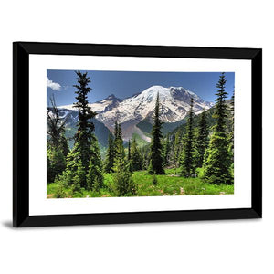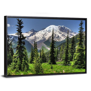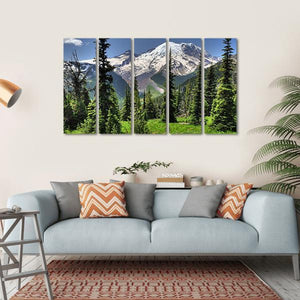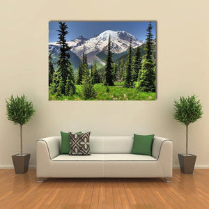 Bring the beauty of nature into your space with this canvas art featuring a majestic snow-capped mountain surrounded by lush pine trees and a vibrant grassy meadow. The serene palette of greens, whites, and blues creates a natural atmosphere that will uplift any room.