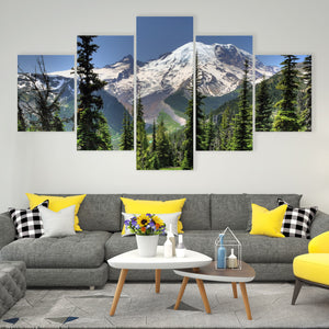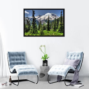 This beautiful canvas artwork captures the majestic Mt. Rainier rising above a serene evergreen forest and grassy meadow. The play of sunlight on the snow-capped peaks evokes a sense of peace, making it a perfect piece for nature lovers.