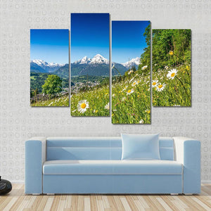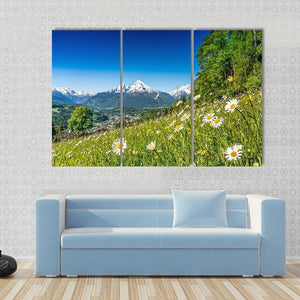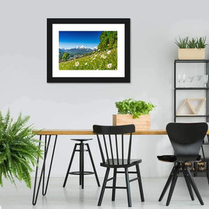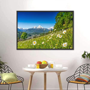 This canvas art beautifully captures a serene landscape of snow-capped mountains, lush meadows, and delicate daisies. The picturesque scene evokes a tranquil atmosphere, making it a delightful addition to any nature-inspired décor.