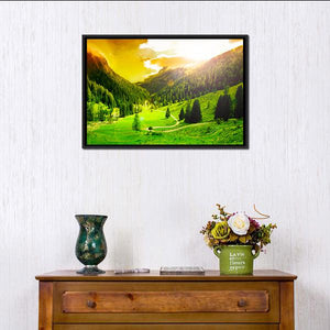 This photorealistic canvas shows a mountain valley framed by a coniferous forest and a winding path, with sunbeams breaking through clouds and lush green grass. The green, yellow, orange, blue and brown palette gives a serene, bright, hopeful mood — a good fit for modern living rooms, bedrooms, or entryways.