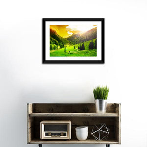 This vibrant canvas art captures a peaceful mountain valley bathed in sunlight, showcasing coniferous trees along a tranquil path. Its realistic depiction creates an awe-inspiring atmosphere, making it a suitable choice for any nature lover's space.