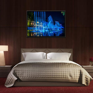 This beautiful canvas art features a mesmerizing fountain scene, illuminated in blue light against a vibrant nighttime backdrop. Its modern design makes it a captivating addition to any wall decor.
