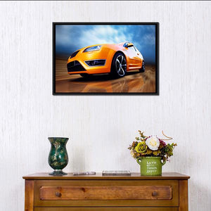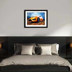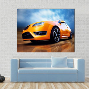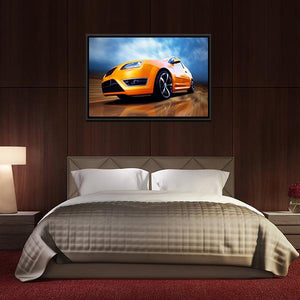 This dynamic canvas showcases an orange sports car in motion, reflecting on the road below against a cloudy sky. Its energetic vibe adds a touch of modern flair to any space.
