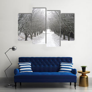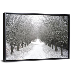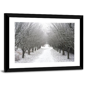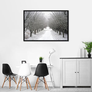 This landscape artwork features a serene path lined with bare trees and a snow-covered ground, evoking a quiet winter atmosphere. Its realistic style and muted gray, white, and brown palette make it a calming addition to your space.