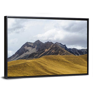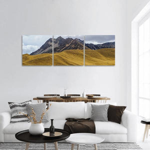Rocks & Mountain features jagged mountain peaks and textured dry grass in a panoramic nature photograph that feels serene and vast. Golden yellow, brown, grey, white and blue tones give a quiet, earthy palette that fits modern or nature-inspired rooms.