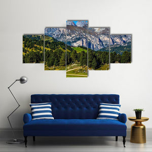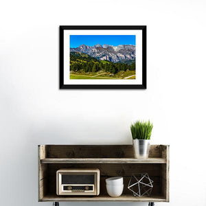 Route In Italian Dolomites Canvas Wall Art captures a photorealistic mountain landscape of the Italian Dolomites with jagged peaks, a dense evergreen forest, a meadow and a winding dirt path beneath a bright blue sky. The scene reads serene, majestic and vast, with a blue-green-gray palette that suits modern or nature-themed rooms.
