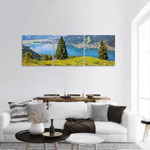 Salzburger Land With Lake presents a panoramic lakeside scene with mountains, a village, grassy hills and two tall evergreen trees. The realistic, scenic print reads serene and picturesque, using a blue, green, white and brown palette. It works well as a calm focal point for modern interiors or nature-themed room decor.