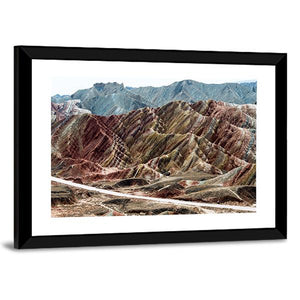 This canvas art showcases the striking beauty of the Zhangye landscape, featuring vibrant rainbow mountains and layered rock formations. The vivid colors of red, orange, and yellow are balanced by earthy browns and grays, creating a powerful connection to nature.
