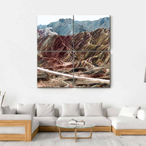 Immerse yourself in the breathtaking beauty of Zhangye with this canvas wall art showcasing the stunning rainbow mountains. The wide shot captures vibrant rock formations and a winding dirt road against an arid landscape, evoking a natural and awe-inspiring mood.