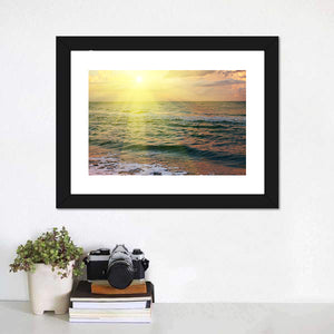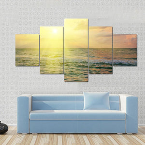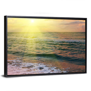 This canvas art captures a serene ocean sunset, highlighting the vibrant blues and warm yellows. The photorealistic style brings the tranquil scene of foaming waves and sun rays through clouds to life, making it a perfect addition to coastal-themed decor.