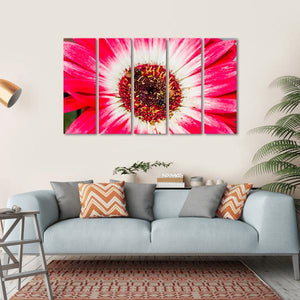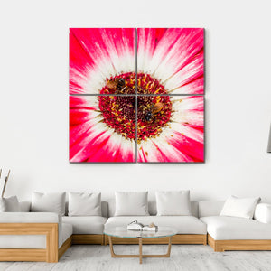 This vibrant canvas features a close-up of a gerbera daisy, complete with two bees collecting pollen. The lively pink and white petals paired with earthy brown and yellow tones create a natural atmosphere, making it a beautiful addition to any decor.
