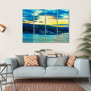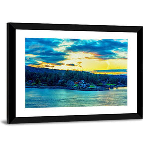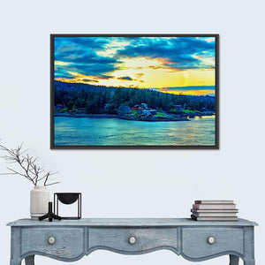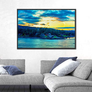 This canvas showcases a vibrant landscape of the Strait of Georgia, featuring a serene island surrounded by calm water. Dramatic clouds hover over the scene, creating a majestic atmosphere that beautifully captures nature's essence.