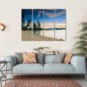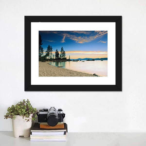 This photorealistic artwork features a serene scene of Lake Tahoe after sunset, capturing the tranquil colors of blue, tan, and green. The peaceful composition showcases soft sand, gentle water, and distant hills, making it a perfect addition to any nature-inspired décor.