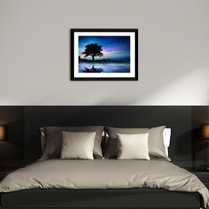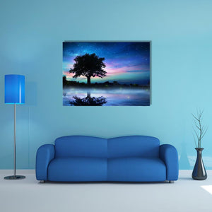 A centered tree stands beneath a starry night sky, its silhouette mirrored in calm water with glowing particles on the surface. Rendered in blues, purples and pinks, this modern landscape creates a calm, dreamy mood and suits modern room decor like living rooms or bedrooms.