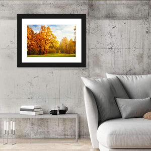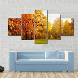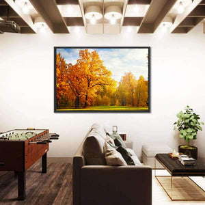 This canvas features a serene autumn landscape, showcasing vibrant fall trees with a majestic oak at its center. The peaceful scene, with sunlight filtering through leaves and fluffy clouds, adds warmth and color to any room.