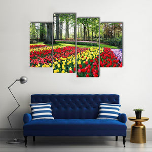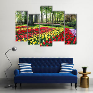This canvas art captures a vibrant tulip field, accented by spring hyacinths and tall trees. The cheerful palette of red, yellow, and green radiates serenity, making it a delightful addition to any space.