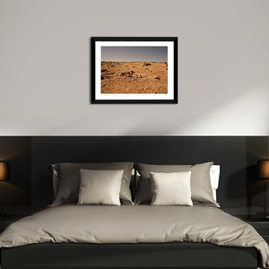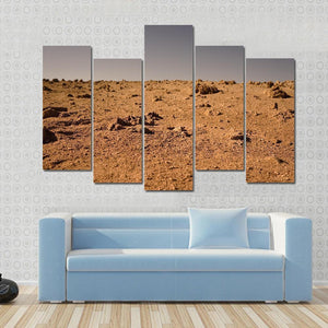 This canvas wall art features a striking portrayal of Mars, showcasing arid ground and rocky landscapes under a clear sky. The desolate yet serene mood invites contemplation and wonder, making it an intriguing addition to your home decor.