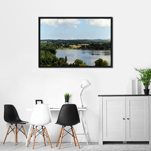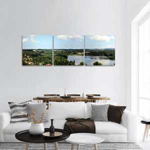 A photorealistic panoramic landscape depicting a lake and a village nestled among trees beneath a blue sky with scattered clouds. Soft blues, greens and warm browns give the scene a peaceful, idyllic feel that fits modern and nature-themed rooms.