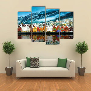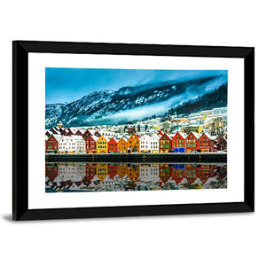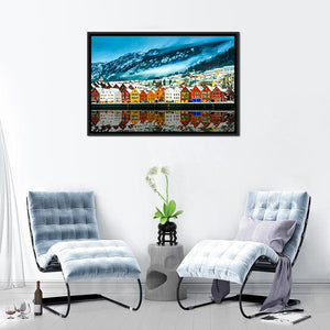 A realistic landscape of colorful buildings tightly packed along a waterfront, their mirror-like reflections below and snow-capped mountains in the background. The picturesque, cheerful scene brings a calm, bright touch to modern living rooms or hallways with a love for realistic landscape art.