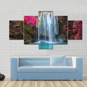 This vibrant canvas art showcases a serene waterfall nestled in a lush jungle, surrounded by striking tropical foliage. The realistic depiction captures the beauty of nature, making it a perfect addition to any room.