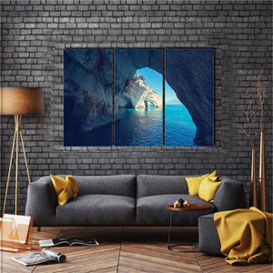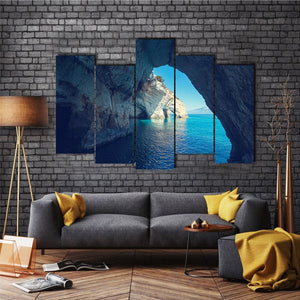 This canvas art beautifully captures a serene sea cave on Zakynthos Island, Greece. With sunlight streaming through an archway and vibrant blue waters, it adds a majestic touch to any space.