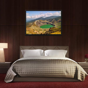 This stunning canvas features a serene volcanic crater lake surrounded by majestic mountains and clouds. Its natural hues of green and brown create a calming atmosphere, making it an ideal addition to any room that embraces nature-inspired decor.