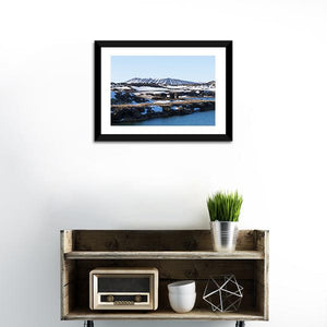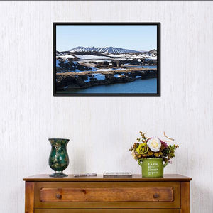 This canvas art captures a serene winter landscape featuring a snow-covered mountain and rocky terrain beside a body of water. The cool palette of blues, whites, and browns evokes a stark and tranquil atmosphere, making it a perfect piece for nature lovers.
