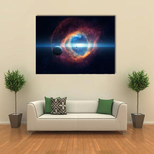 The Beauty Of Space Canvas Wall Art captures the awe-inspiring vastness of the cosmos. Featuring a glowing blue light beam cutting through a ring nebula that resembles an eye, alongside two visible planets, this artwork adds a mysterious and modern touch to any décor.