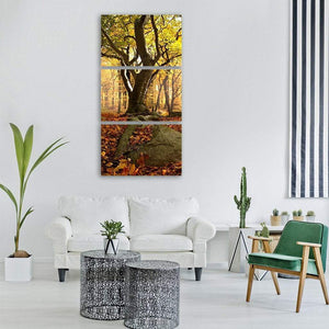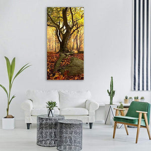 A peaceful, autumnal beech forest scene with sunlight filtering through yellow and brown leaves. The realistic, low-angle composition highlights gnarled tree roots, fallen leaves, and rocky ground to create a calm, serene mood. Suited to modern or nature-inspired rooms.