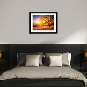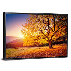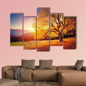 Beech Tree On A Hill Slope shows a beech tree with golden autumn leaves as the sun sets behind rolling hills, sending warm beams across an orange-and-yellow sky. The realistic, vibrant colors create a serene, golden mood that suits modern living rooms and nature-inspired spaces.