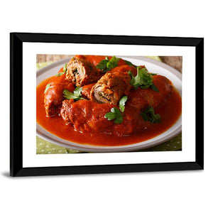 This close-up artwork of rouladen captures the appetizing essence of beef rolls drizzled in rich tomato sauce and garnished with fresh parsley. It brings a savory and hearty vibe, perfect to enhance your kitchen or dining area.