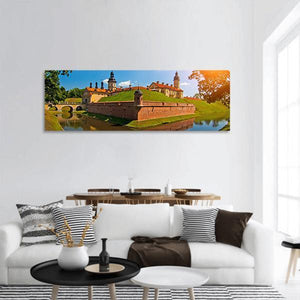 Belarus Castle Panoramic Canvas Art shows a photographic view of a castle with red brick ramparts, domed towers and their reflection in the moat. The panoramic composition and a bright, serene palette of blue, green, orange and brown suit modern or classic room décor as a historic, peaceful focal point.