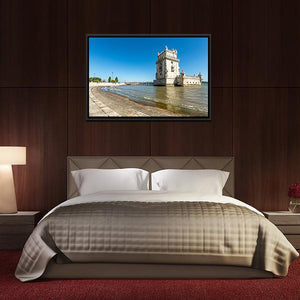 A panoramic photographic canvas of Belem Tower beside the Tagus River in Lisbon, rendered in a realistic landscape style. Bright blues, white and soft greys give a serene, historic mood—note the stone tower’s intricate carvings, calm water, pedestrian bridge, and people along the shore; this piece suits living rooms or offices as tasteful room decor.