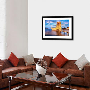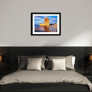Belem Tower in Portugal stands centered above the Tagus River, bathed in warm golden daylight for a majestic, historic, and serene feel. Ornate architecture, clouds, and soft reflections on the water give it a coastal mood that complements coastal, historic, or modern interiors.