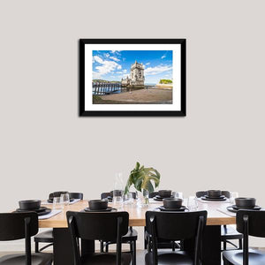 Belem Tower on the Tagus River in Portugal is shown in a photorealistic panoramic canvas that highlights the stone tower, wooden pier, and calm water reflecting a blue sky. The scene feels historic and serene, suited to coastal or modern room decor.