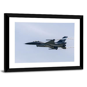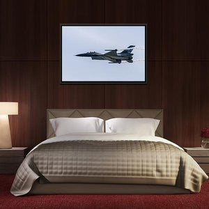 This panoramic canvas features an F-16 fighter jet in flight, complete with Belgian Air Force markings and streaming contrails, captured in a blue, white, black and gray palette. Its modern, dynamic energy suits contemporary living rooms, home offices, or military-themed spaces as an airborne focal point.