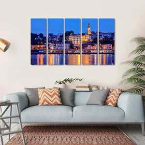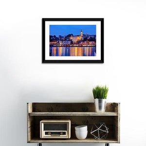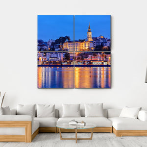 This canvas features a stunning city skyline of Belgrade, capturing the tranquil beauty of the river and illuminated buildings at dusk. The vibrant palette of blue, yellow, and white brings the scene to life, making it a striking addition to your décor.