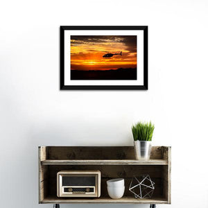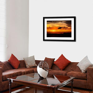 A silhouetted helicopter crosses a cloudy orange sunset, rendered in a minimalist, modern palette of orange, yellow, brown and black. The rule-of-thirds panoramic composition feels dramatic yet serene and suits modern living rooms or office walls.