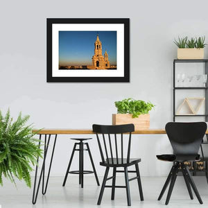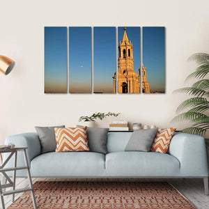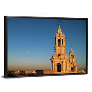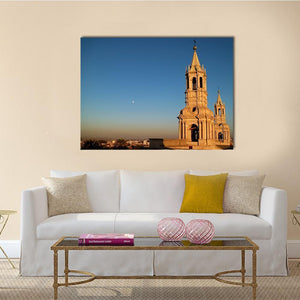 This canvas wall art beautifully captures the Bell Tower in Arequipa, showcasing its ornate architecture against a serene sunset sky. With soft hues of blue, tan, and gold, it invites a peaceful ambiance, perfect for any room in your home.