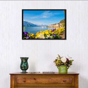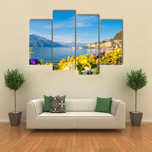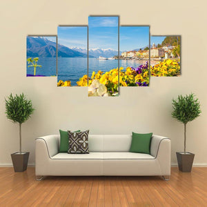 Village On Lake Como places a tranquil lakeside village front and center, with colorful flowers in the foreground, a small boat on the water, and snow-capped mountains rising behind the buildings. The blue, green and yellow palette creates a peaceful, sunny, scenic mood that works well with modern room decor.