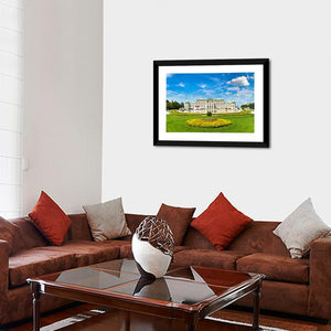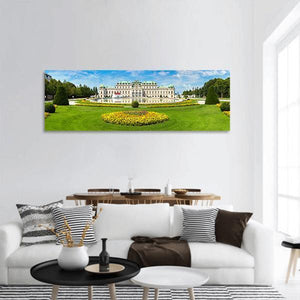 A panoramic view of the Belvedere Museum in Austria, showing the ornate palace set behind manicured trees and a circular flower bed. The realistic landscape uses greens, blues, whites and soft yellows for a grand, serene, idyllic mood that fits traditional or modern interiors like living rooms, hallways, or offices.